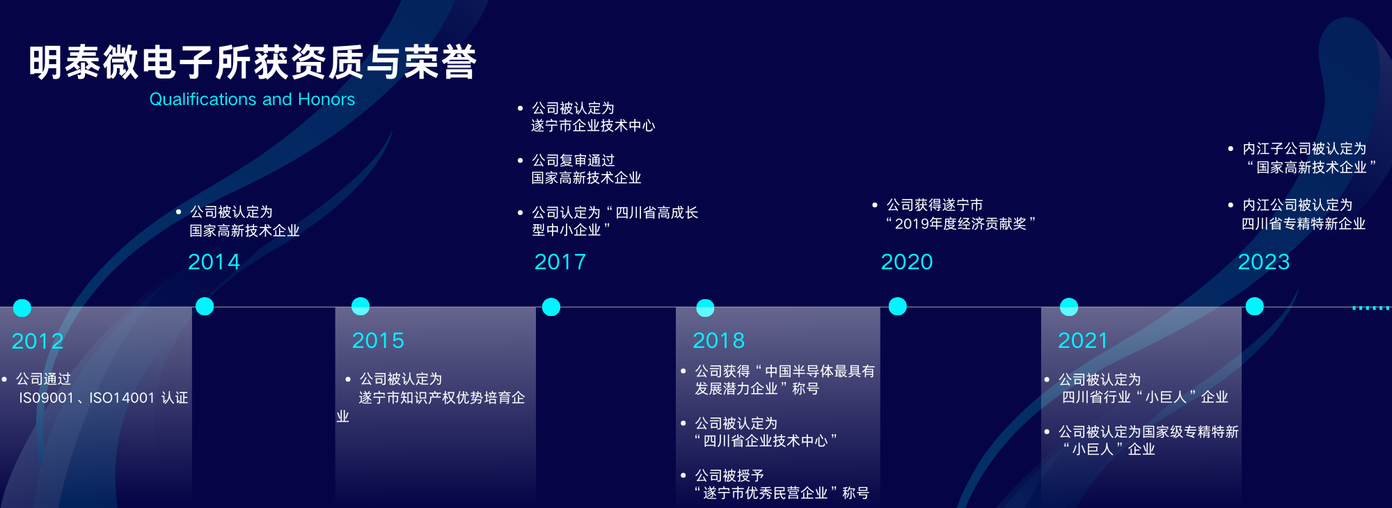 四川明泰電子科技有限公司獲得的資質(zhì)和榮譽(yù) ?2012年,公司通過ISO9001和ISO14001認(rèn)證; 2014年,公司認(rèn)定為“國家高新技術(shù)企業(yè)”; 2015年,公司認(rèn)定為“遂寧市知識產(chǎn)權(quán)優(yōu)勢培育企業(yè)”;